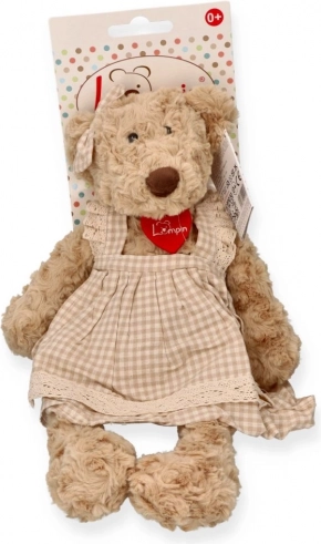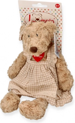 Orsetto di peluche Lumpinka con vestitino a quadri. Morbido, sicuro da 0+, ideale per coccole e come decorazione. Lavaggio a mano 30 °C, circa 43 × 25 cm.