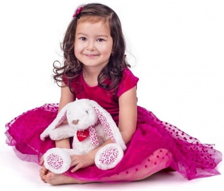 Le orecchie, le zampette e il fiocchetto con un delicato motivo floreale rosa donano al giocattolo un aspetto incantevole che conquisterà bambini e genitori.