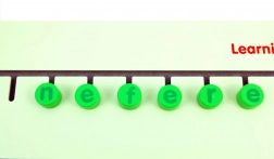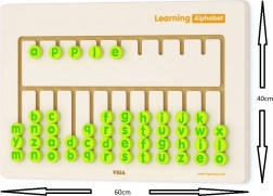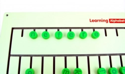 I gettoni verdi con le lettere si inseriscono e scorrono nelle scanalature, permettendo ai bambini di esercitarsi in modo giocoso nel riconoscimento delle lettere e nella composizione di semplici parole, come “apple”.
