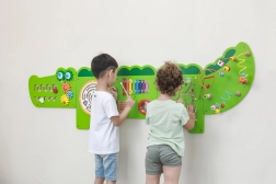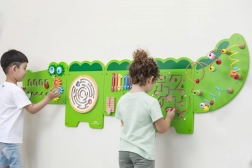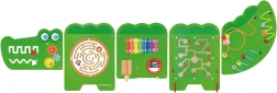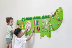 Il pannello da parete Coccodrillo, suddiviso in cinque sezioni, offre ai bambini diverse attività: parte della testa con labirinti e ingranaggi, labirinto circolare con pallina, pannello musicale con xilofono colorato e superficie a frizione, labirinto magnetico con due matite magnetiche e coda con tre piste 3D a perline. Ogni sezione supporta una diversa abilità e incoraggia i bambini a esplorare.