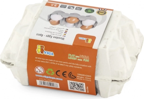 Sei uova di legno in una vaschetta di cartone che sembrano una confezione vera. Ideale per la cucina dei bambini e il mercato.