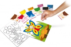 Il gioco artistico della pittura con la sabbia consiste nel rimuovere gradualmente le singole parti pretagliate dell’immagine per scoprire la superficie adesiva del frammento scelto. Ogni frammento scoperto viene cosparso di sabbia del colore corrispondente al modello illustrato nelle istruzioni e sulla confezione.