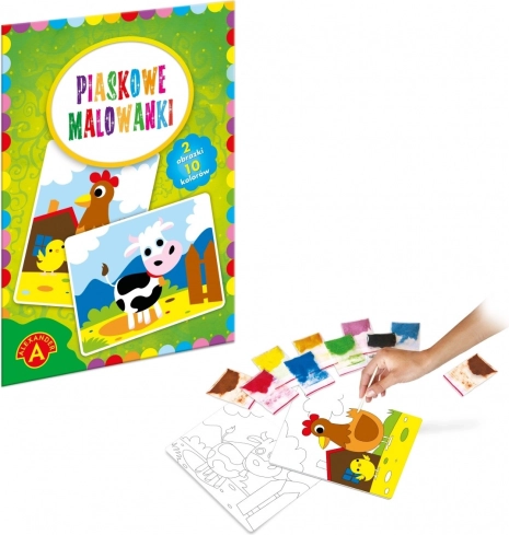 Il gioco artistico di dipingere con la sabbia consiste nel rimuovere gradualmente le singole parti pretagliate dell’immagine per scoprire la superficie adesiva del frammento scelto. Ogni frammento scoperto viene cosparso di sabbia del colore corrispondente al modello illustrato nelle istruzioni e sulla confezione.
