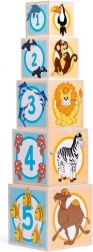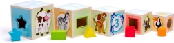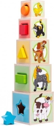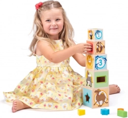 La torre in legno con bicchieri e ordinatore di forme unisce la costruzione in altezza all'esercizio di inserire le forme giuste nei fori corrispondenti. I bambini sviluppano la coordinazione occhio–mano, imparano colori, numeri e animaletti e si divertono con un gioco creativo.