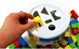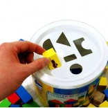 Il secchio con coperchio presenta aperture sagomate in cui i bambini inseriscono i blocchi corrispondenti, supportando lo sviluppo delle capacità di riconoscimento.