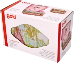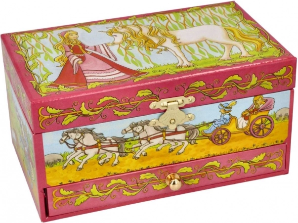 Il portagioie in stile carillon è l'accessorio ideale per piccole signorine che desiderano conservare i loro gioielli con eleganza. All'apertura, suona la melodia dall'opera Il Lago dei Cigni e il cavallino bianco inizia a danzare davanti allo specchio.