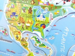 La mappa contiene i nomi degli oceani, degli stati e delle città in inglese. I pezzi sono realizzati in compensato di legno resistente con magneti incorporati. Il prodotto è progettato per essere facilmente appeso al muro.
