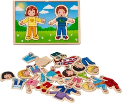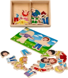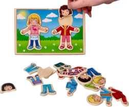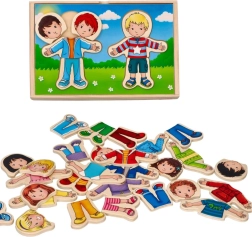 Questo popolare puzzle di vestiti è realizzato in legno di alta qualità, che è non solo resistente ma anche ecologico. Viene fornito in una pratica scatola di legno con coperchio, che funge anche da base per l'assemblaggio. Grazie allo scambio di teste, corpi e gambe, i bambini possono creare innumerevoli creazioni e divertirsi molto.