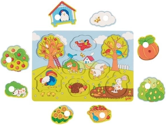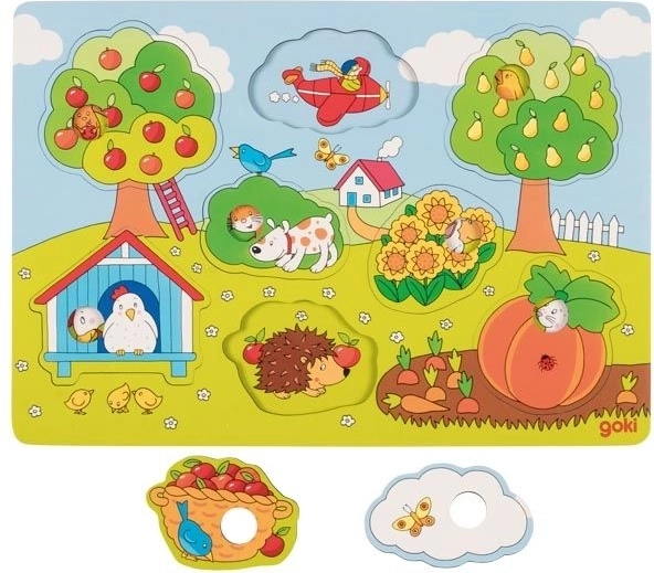 Goki puzzle in legno Nel giardino è un giocattolo colorato, ideale per lo sviluppo delle capacità motorie e cognitive dei bambini. Ha otto pezzi colorati con immagine di fondo che si adattano perfettamente alla sua base di legno.