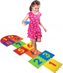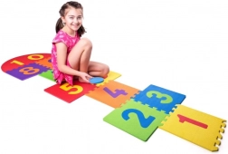 Saltare sui pezzi numerati e lanciare gli anelli sviluppa equilibrio, coordinazione, destrezza e percezione numerica.