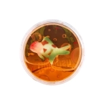 Contenitore trasparente compatto con un pesciolino dall'aspetto realistico e elementi decorativi per un piacere visivo.