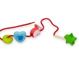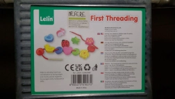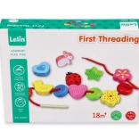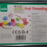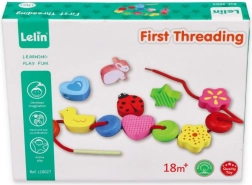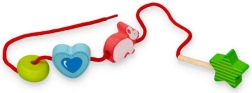 Cordoncino in tessuto con estremità in legno per facilitare l'infilatura, aiuta a sviluppare la motricità fine.