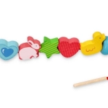 Diverse perline di legno a forma di animali, cuori e fiori, ideali per sviluppare la creatività nei bambini.