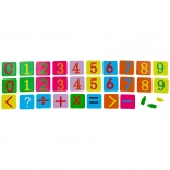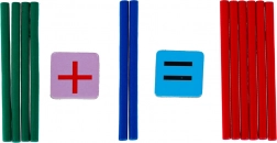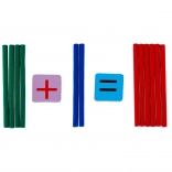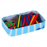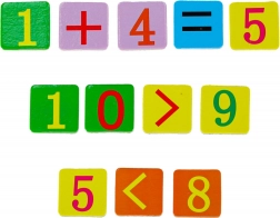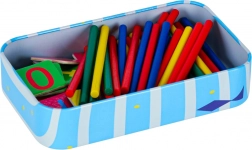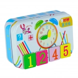 - 50 bastoncini colorati in legno, 4× lancette dell’orologio, 28 tessere magnetiche con numeri e simboli matematici, custodia in metallo