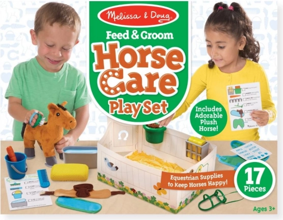Questo set di cura con un morbido cavallino di peluche è il gioco ideale per i piccoli amanti dei cavalli. Include accessori come spazzola, spugna, carota e mangiatoia, che favoriscono un gioco realistico in fattoria e l’apprendimento della cura degli animali. Grazie ai colori vivaci e ai materiali piacevoli, i bambini si innamoreranno del gioco.