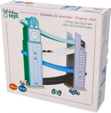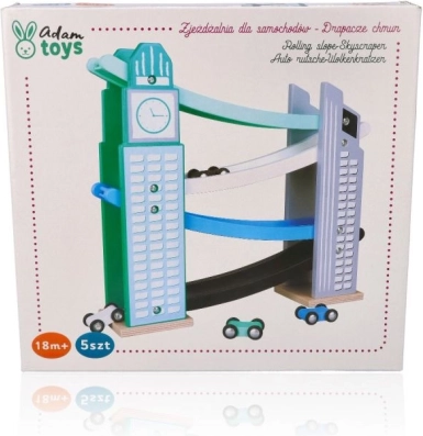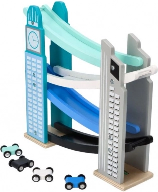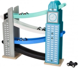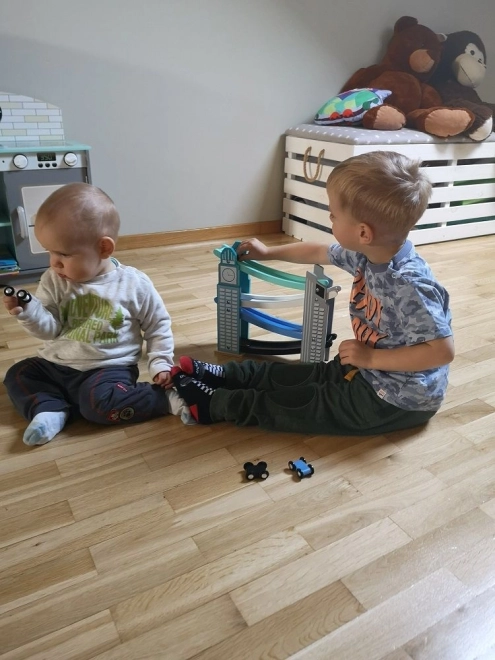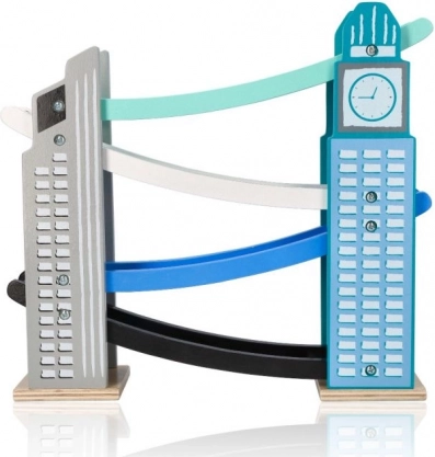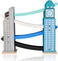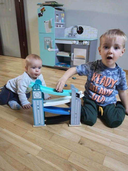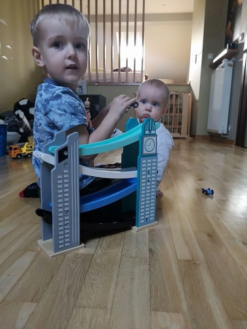La nostra pista in legno è progettata per richiamare le iconiche costruzioni cittadine, inclusa una torre con orologio. È realizzata in legno di alta qualità e offre diversi livelli con rampe colorate in blu, nero e bianco. I bambini si divertiranno a far scendere le piccole macchinine colorate dalla cima fino in fondo. La pista non solo intrattiene, ma sviluppa la motricità fine e insegna principi fisici come gravità e velocità.