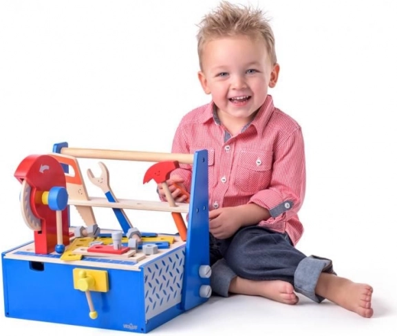- Pratica sicura con strumenti: Strumenti in legno come sega, chiave e martello per un gioco sicuro.