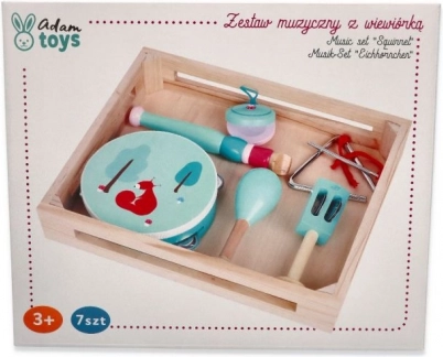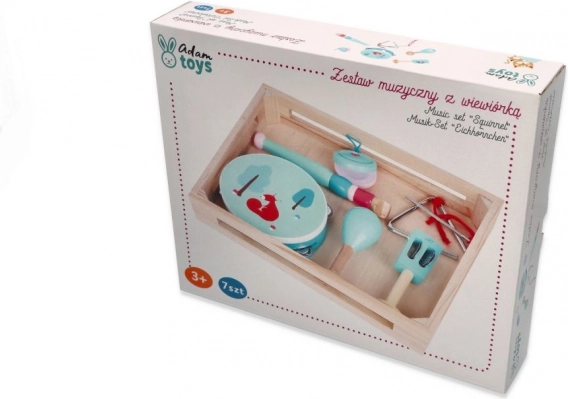 Nel set trovi un tamburello con quattro sonagli e un simpatico scoiattolo, un flauto color menta, maracas con motivo floreale, nacchere con funghetto, campanelli a mano con fogliolina, triangolo in metallo con bacchetta e tutto riposto in un pratico vassoio/scatola in legno per un facile riordino e trasporto. Perfetto per fare musica a casa, all’asilo e nel doposcuola.
