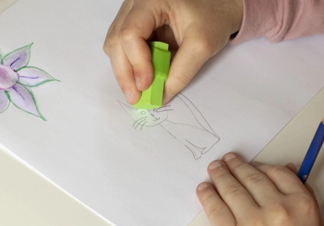 L'impugnatura sagomata aumenta comfort e precisione. La gomma non scivola in mano e la cancellatura è rapida e sicura anche per i bambini.