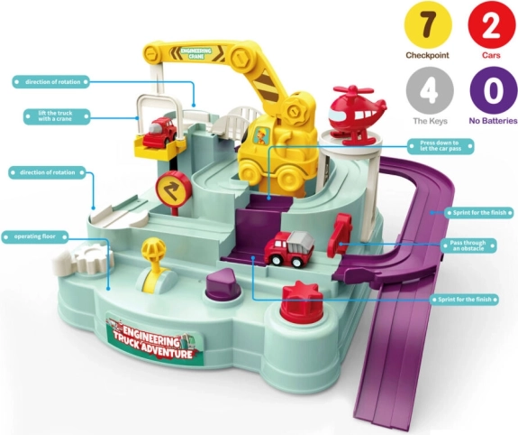 Questo percorso a ostacoli trasforma ogni corsa in una piccola avventura. Lungo il tracciato ci sono vari ostacoli che i bambini superano grazie ai comandi intelligenti con rotelle e leve. Ogni successo li motiva a riprovare, portando tanta gioia e sana competitività.