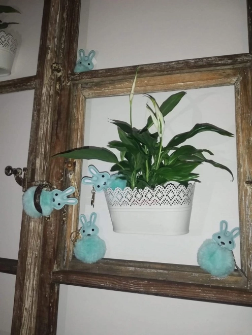 Adorabile decorazione sospesa con motivo coniglio e morbido pompon dal diametro di 7 cm, perfetta per ravvivare qualsiasi interno. Dimensioni compatte 12 × 8 cm e facile da appendere. Oggetto decorativo – non è un giocattolo.