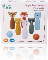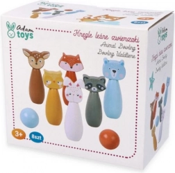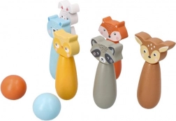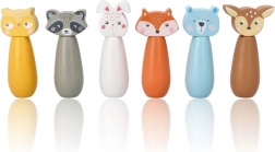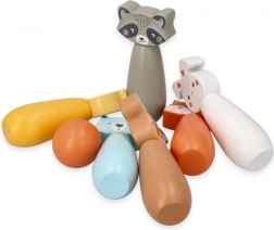 Birilli colorati con motivi di volpe, orso, coniglio, procione, cervo e altri animali che invitano al gioco e stimolano la fantasia dei bambini.