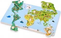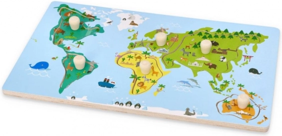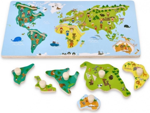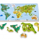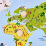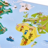 Il puzzle mostra i continenti con colori vivaci e animali e monumenti disegnati, facilitando l'apprendimento e rendendo la geografia divertente per i bambini.
