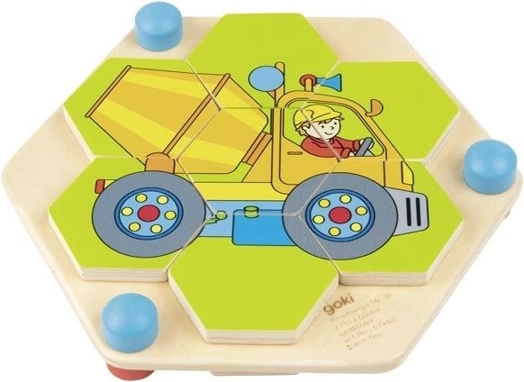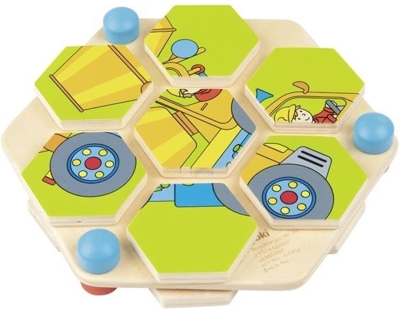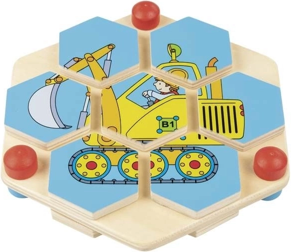 Lascia che i tuoi bambini si immergano nel mondo della creatività con questo splendido puzzle in legno a forma di esagono. Ogni esagono rotante deve essere posizionato correttamente per creare un'immagine colorata delle macchine da costruzione. Questo rompicapo è posto su una robusta tavola di legno naturale, che garantisce lunga durata e sostenibilità. Il giocattolo non solo offre ore di divertimento, ma aiuta anche a sviluppare il pensiero logico e la coordinazione occhio-mano.
