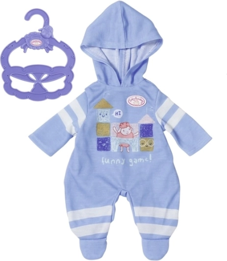 Variante 1: Elegante tutina blu con cappuccio, decorata con una simpatica stampa a ossicini, ideale per i giochi all’aperto.