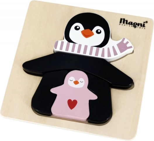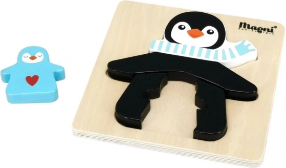 Adorabile puzzle in legno con il motivo di un pinguino e dei suoi cuccioli, ideale per i più piccoli a partire da 18 mesi. Favorisce la motricità fine, il pensiero logico e le abilità di coordinazione. La realizzazione in legno di qualità e le piacevoli dimensioni 14,5 × 14,5 cm sono ideali per le piccole mani.