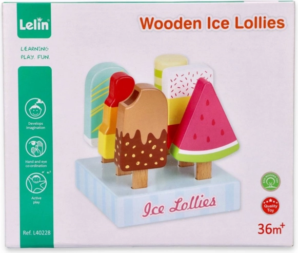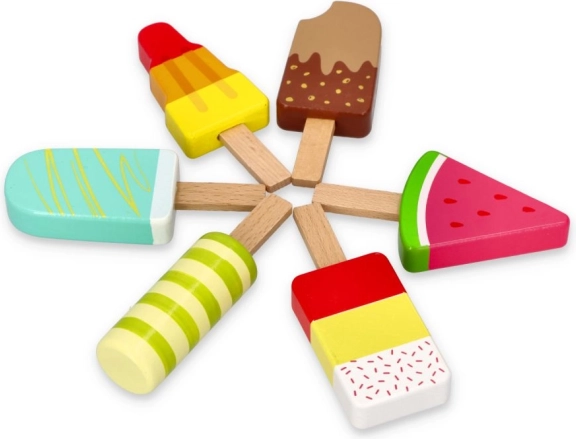 Sei originali ghiaccioli in legno con forme e motivi diversi ispirano a un gioco fantasioso ed esercitano l’immaginazione.