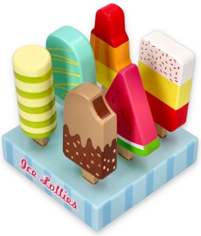 Un set colorato di ghiaccioli in legno con pratico supporto offre ai bambini dai 3 anni ore di gioco creativo. Stimola la fantasia, il gioco di ruolo di negozio e gelateria e sviluppa la motricità fine e la coordinazione occhio–mano. La struttura in legno resistente, i colori sicuri e i design adorabili fanno di questi ghiaccioli un giocattolo preferito in ogni cameretta.