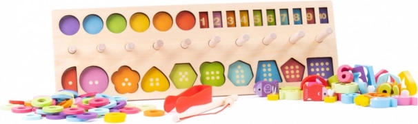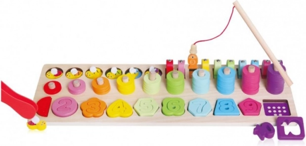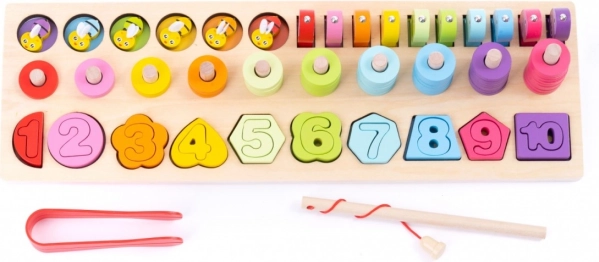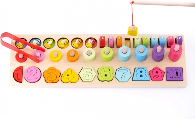 - 4-in-1: conteggio 1–10, classificazione di forme e colori, infilatura di anelli, pesca magnetica