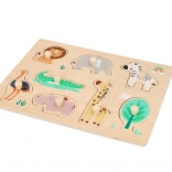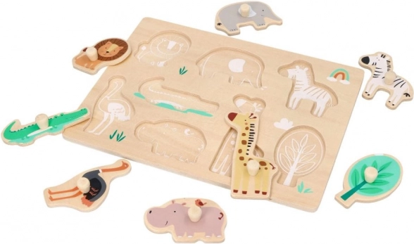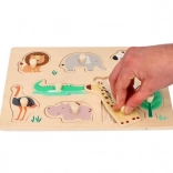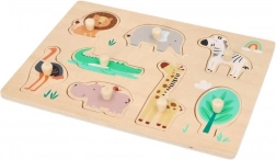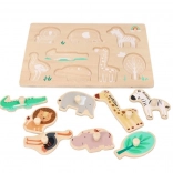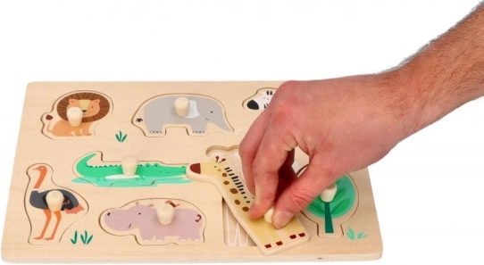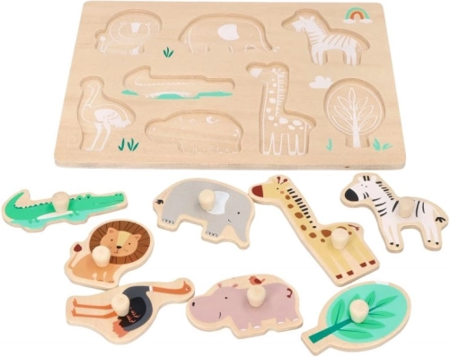 Questo puzzle in legno con motivi Safari è ideale per bambini dai 12 mesi. Ogni pezzo del puzzle rappresenta un diverso animale, come il leone, l'elefante o la giraffa, favorendo il riconoscimento degli animali. Il puzzle è progettato con supporti per una facile presa e manipolazione, ottimo per lo sviluppo della motricità fine nei bambini piccoli.