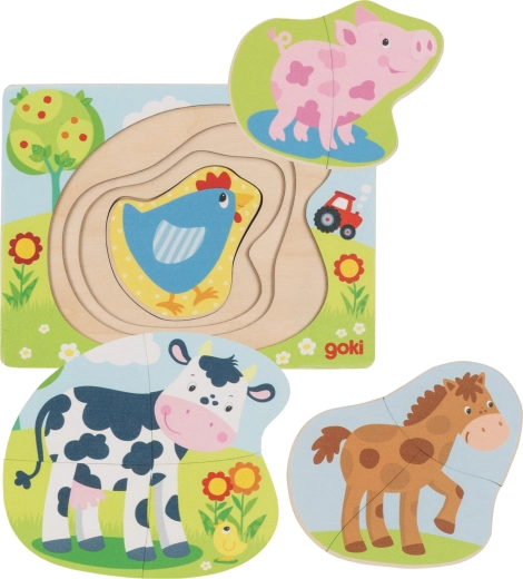 Scoprite il divertente puzzle a più strati con gli animali della fattoria di GOKI, che sviluppa fantasia e abilità dei bambini. Grazie alla composizione progressiva dei singoli strati, i bambini esercitano la motricità fine, i primi calcoli e il riconoscimento degli animali. La solida tavoletta di base facilita la composizione e ogni “piano” ha dimensioni diverse, adatte a un animale differente.