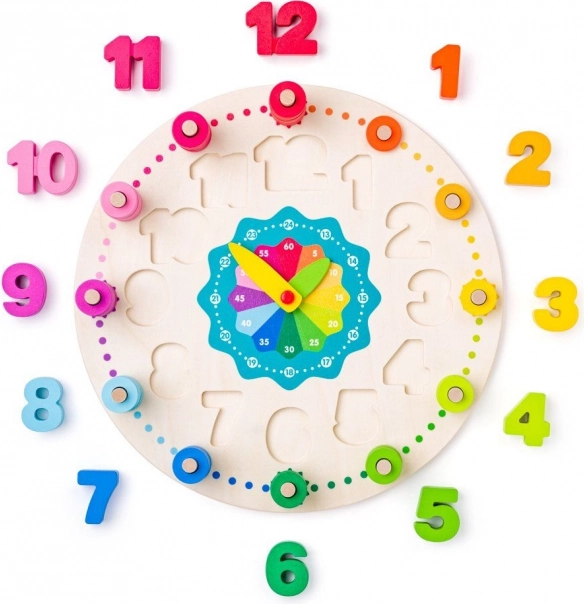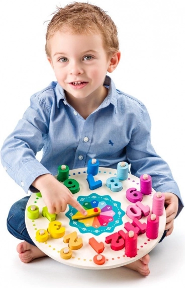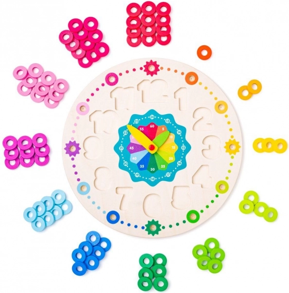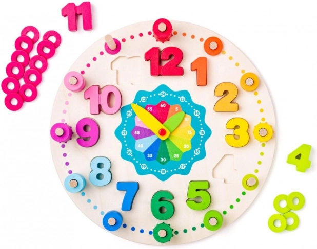 L’orologio didattico in legno dal diametro di 30 cm ha un quadrante principale con lancette mobili e due scale ausiliarie per 13–24 ore e minuti a intervalli di 5. I bambini esercitano l’impostazione precisa dell’ora, la motricità fine e il pensiero logico. I blocchi rimovibili con i numeri 1–12 sviluppano il riconoscimento di forme e colori, mentre le aperture dietro i numeri servono per inserire i piolini e infilare successivamente gli anelli.
