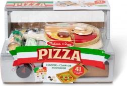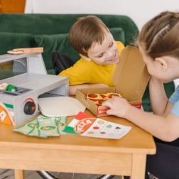 Include una pizza in legno, vari condimenti e soldi finti, permettendo ai bambini di vivere l'intero processo di preparazione e vendita della pizza.