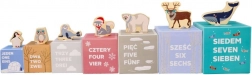 - cifre 1–7, numero corrispondente di animaletti, nomi dei numeri in 3 lingue (PL/EN/DE), intagli per scenette