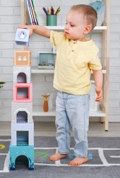 Impilare, bilanciare e inserire i cubi uno nell’altro favorisce la motricità fine, la coordinazione occhio–mano e la percezione spaziale. Prima costruzione ideale per bambini 12m+.