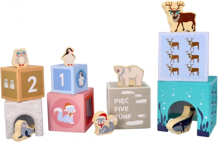 Ogni cubo offre più del semplice costruire: trovi le cifre 1–7, il numero corrispondente di animaletti, immagini degli amici polari e i nomi dei numeri in tre lingue (PL/EN/DE). Grazie ai pratici intagli i bambini creano facilmente casette, zoo e piccole scenette. I cubi si possono inserire uno nell’altro, così il gioco si ripone e si trasporta con facilità.