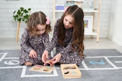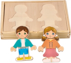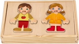 Questo puzzle magnetico in legno con le figure di un ragazzo e una ragazza offre decine di possibilità per vestirli e combinare i singoli pezzi. Durante il gioco i bambini allenano la coordinazione occhio–mano, il pensiero logico e la percezione di forme e colori.