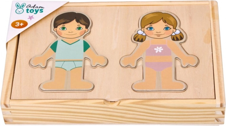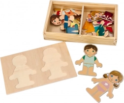 - Figure di ragazzo e ragazza con pezzi magnetici intercambiabili di abbigliamento, scatola/base in legno