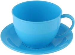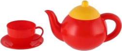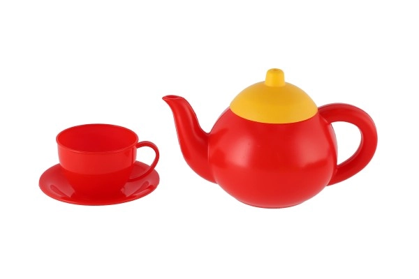 Bollitore rosso e quattro tazzine colorate con piattini per “preparare e servire” il tè a tutta la famiglia o agli amici.