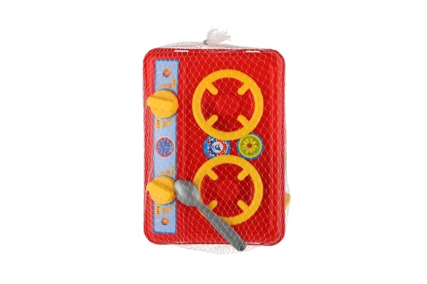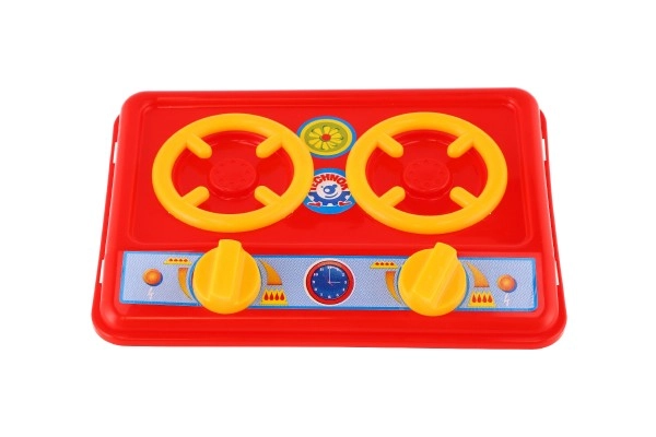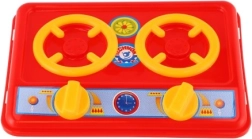 Fornello rosso a due piastre con manopole girevoli che stimola l’immaginazione e insegna ai bambini le basi della cucina in totale sicurezza.