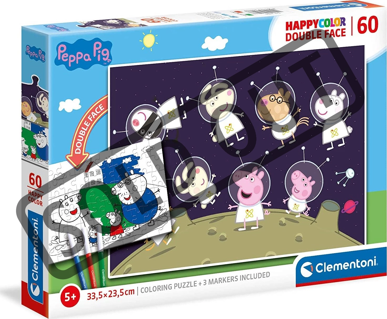Goditi un divertimento creativo con il puzzle double-face Peppa Pig nello spazio. Un lato propone un classico motivo a colori da comporre, l’altro è un disegno in bianco e nero che i bambini possono colorare secondo la loro fantasia. Idea regalo ideale per i piccoli fan di Peppa e delle avventure spaziali.