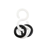 Occhielli in silicone collegabili con rilievo che massaggiano le gengive, stimolano il tatto e consentono una presa facile. I ganci a S fissano i giochi al passeggino o al seggiolino auto.
