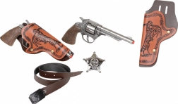 Questo set da cowboy GONHER di alta qualità offre un look realistico e azione sonora grazie al meccanismo per nastri da 8 colpi (a tamburo). La struttura in metallo assicura maggiore resistenza e lunga durata, mentre la fondina e il distintivo inclusi completano l’aspetto autentico del piccolo sceriffo.