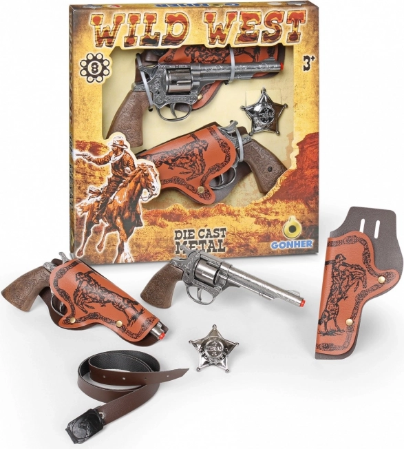 Scopri il divertimento autentico del Selvaggio West con il set GONHER – due revolver da cowboy in metallo con tamburo per 8 colpi, completi di elegante fondina e distintivo da sceriffo. Ideale per giochi a tema, costumi e piccoli avventurieri.