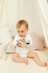 - Sviluppo dei sensi: stimola la vista con i contrasti e l’udito con un delicato tintinnio.