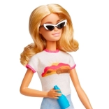 La bambola indossa un elegante outfit estivo con occhiali da sole bianchi e una gonna blu.